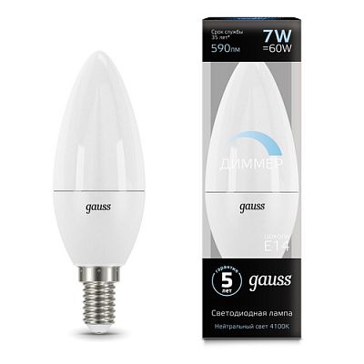 Лампа Gauss LED Свеча-dim E14 7W 590lm 4100К диммируемая 1/10/100