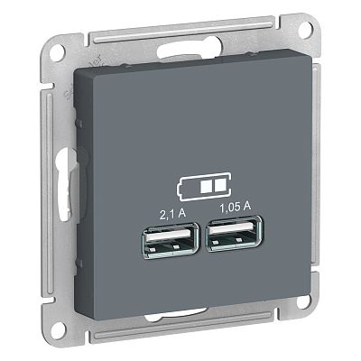 Механизм Schneider Electric AtlasDesign (цвет грифель) розетки для зарядки с двумя разъёмами USB с выходными напряжением 5 В постоянного тока и выходами с номинальным током по 2,1 А. - USB розетка позволяет напрямую заряжать одно или два мобильных устройства. - Лицевые детали из качественного ABS-пластика, устойчивого к царапинам и УФ-излучению. - Усиленные прямые монтажные лапки для лучшей фиксации механизма в монтажной коробке.