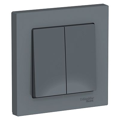 Выключатель Schneider Electric AtlasDesign (в сборе, цвет грифель) 2-клавишный подходит для сетей 250 В, на ток 10 А. - Двухклавишный выключатель позволяет управлять двумя источниками света с одной точки. - Лицевые детали из качественного ABS-пластика, устойчивого к царапинам и УФ-излучению. - Изделие поставляется в комплекте с рамкой того же цвета. - Усиленные прямые монтажные лапки для лучшей фиксации механизма в монтажной коробке.