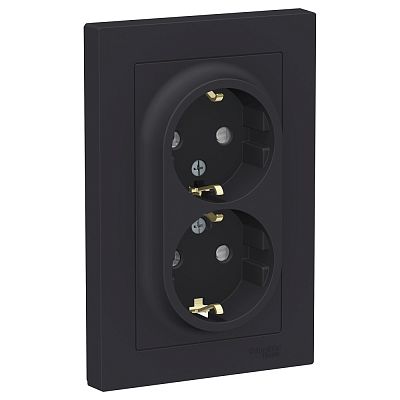 Розетка двойная Schneider Electric AtlasDesign (в сборе, цвет карбон) с заземлением и шторками подходит для сетей 250 В, на ток 16 А. - Заземляющий контакт обеспечивает дополнительную защиту от удара электрическим током. - Двойная розетка позволяет подключить два устройства в одном месте. - Изделие поставляется в комплекте с рамкой того же цвета. - Благодаря покрытию «soft touch» к изделию приятно прикасаться.