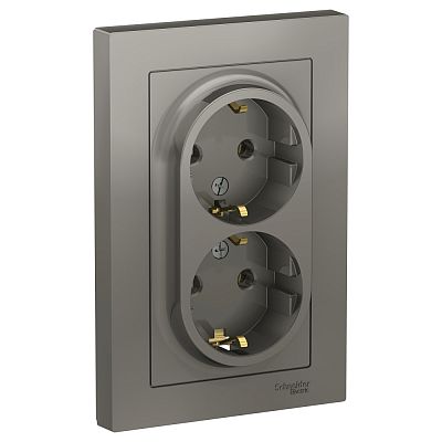 Розетка двойная Schneider Electric AtlasDesign (в сборе, цвет сталь) с заземлением, без шторок подходит для сетей 250 В, на ток 16 А. - Заземляющий контакт обеспечивает дополнительную защиту от удара электрическим током. - Лицевые детали из качественного ABS-пластика, устойчивого к царапинам и УФ-излучению. - Двойная розетка позволяет подключить два устройства в одном месте. - Изделие поставляется в комплекте с рамкой того же цвета.