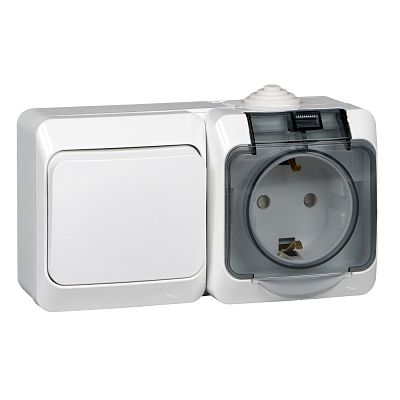 ЭТЮД открытая установка Белый Блок: Розетка с заземлением со шторками + Выключатель 1 клавишный IP44 Systeme Electric (Schneider Electric)
