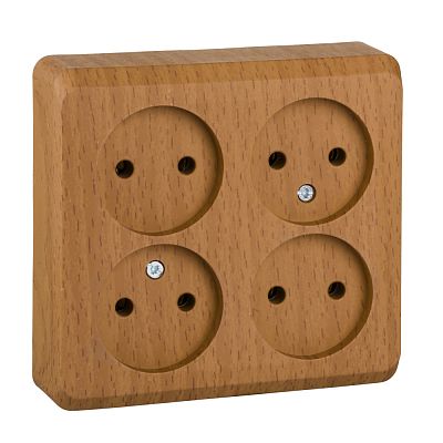 Розетка Schneider Electric ЭТЮД (бук, открытой установки) четырёхместная, без шторок и заземления предназначена для применения в сетях до 250В, на ток до 16А. Четырёхместная розетка позволяет подключить четыре устройства в одном месте. Она проста в установке и удобна в применении. Изделия цвета Бук обладают уникальным рисунком, напоминающим древесный сруб. Сделано в России.