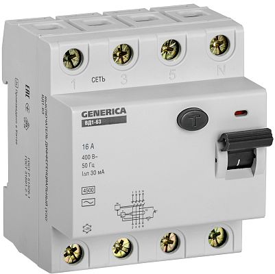 Быстродействующий защитный выключатель ВД1-63 (УЗО) GENERICA - устройство электронного типа, зависящее от напряжения и реагирующее на дифференциальный ток, без встроенной защиты от сверхтоков. Предназначен для защиты человека от поражения электрическим током.