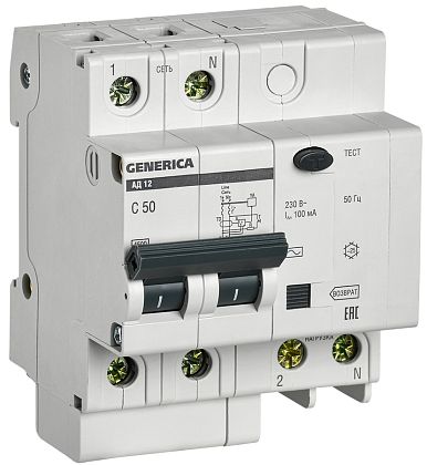 Выключатель автоматический дифференциального тока двухполюсный C 50А 100мА тип AC 4.5кА АД-12 IEK (MAD10-2-050-C-100)