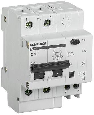 Выключатель автоматический дифференциального тока двухполюсный 10А 30мА АД12 GENERICA IEK