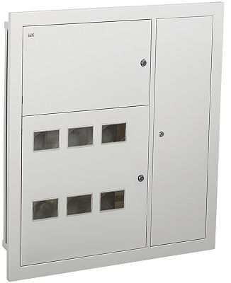 Используется для сборки этажного распределительного щита на 6 квартир, предназначенного для приема и распределения электроэнергии в жилых и общественных зданиях, а также для защиты отходящих линий при перегрузках и коротких замыканиях. Сварной металлический корпус состоит из трех отсеков: вводно-учетного, распределительного, отсека слаботочного оборудования. В вводно-учетном и распределительном отсеках размещены DIN-рейки для крепления счетчиков (по количеству квартир). В распределительном отсеке установлены DIN-рейки для аппаратов групповых линий и рейка для установки шин N и РЕ. Отсек укомплектован оперативной панелью. Отсек слаботочного оборудования снабжен перфорированными профилями для прокладки теле- и радиосетей, телефонных линий, сетей охранной сигнализации, домофонов и т.п. Для обеспечения пожарной безопасности между слаботочным и силовым отсеками расположена разделительная перегородка.