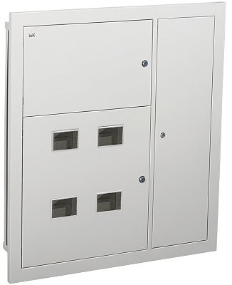Используется для сборки этажного распределительного щита на 4 квартиры, предназначенного для приема и распределения электроэнергии в жилых и общественных зданиях, а также для защиты отходящих линий при перегрузках и коротких замыканиях. Сварной металлический корпус состоит из трех отсеков: вводно-учетного, распределительного, отсека слаботочного оборудования. В вводно-учетном и распределительном отсеках размещены DIN-рейки для крепления счетчиков (по количеству квартир). В распределительном отсеке установлены DIN-рейки для аппаратов групповых линий и рейка для установки шин N и РЕ. Отсек укомплектован оперативной панелью. Отсек слаботочного оборудования снабжен перфорированными профилями для прокладки теле- и радиосетей, телефонных линий, сетей охранной сигнализации, домофонов и т.п. Для обеспечения пожарной безопасности между слаботочным и силовым отсеками расположена разделительная перегородка.