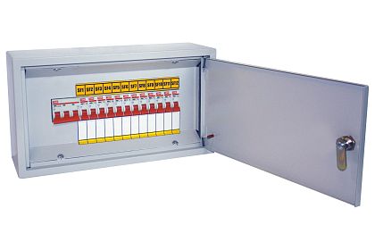 Предназначены для приема и распределения электроэнергии в жилых и производственных помещениях, а также для защиты линий при перегрузках и коротких замыканиях в сетях переменного тока напряжением 230/400 В. Внутри корпуса установлены вводные, трехполюсные и групповые, однополюсные автоматические выключатели, а также шины N и РЕ.