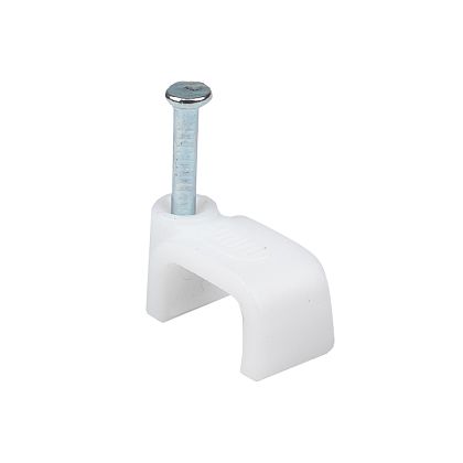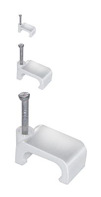 Скоба 9мм плоская пластиковая (1 уп = 100шт.) ИЭК///Предназначены для быстрого и надежного крепления круглых и плоских кабелей. Возможно крепление к дереву, прессованному картону и швам кирпичной кладки, к штукатурке, бетону, кирпичу. Изготовлены из гибкого негорючего ударопрочного полипропилена, гвоздь - закаленная оцинкованная сталь.