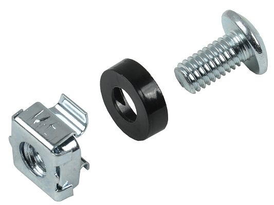 Набор винт-шайба-гайка необходимы для крепления оборудования на монтажные профили шкафов и стоек. Гайки в наборе имеют квадратную форму и специальные "лапки", прочно фиксирующие их в квадратном отверстии монтажных профилей, что облегчает установку оборудования, т.к. нет необходимости держать гайку руками. Также в наборе предусмотрены пластиковые шайбы, предотвращающие повреждение оборудования при затягивании винтов в гайку. Винты имеют резьбу М6. Наборы упаковываются в полиэтиленовый пакет с минимальным количеством комплектов винт-шайба-гайка в одной упаковке - 20 штук.
