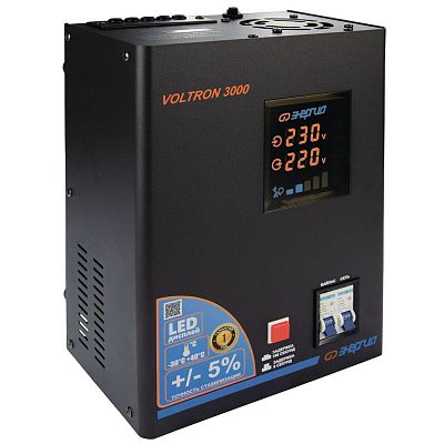 Стабилизатор напряжения Энергия Voltron 3000 (5%) -релейный однофазный стабилизатор напряжения переменного тока предназначен для стабилизации переменного напряжения в сети электроснабжения для потребителей бытового и аналогичного назначения. Данная модель отличается широким диапазоном входного напряжения – от 95 до 280 вольт. Это позволяет получать стабильное напряжение даже в самых проблемных электросетях.
