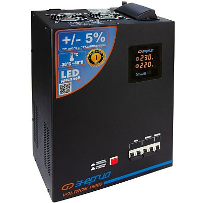 Стабилизатор напряжения Энергия Voltron 15000 (5%) -релейный однофазный стабилизатор напряжения переменного тока предназначен для стабилизации переменного напряжения в сети электроснабжения для потребителей бытового и аналогичного назначения. Данная модель отличается широким диапазоном входного напряжения – от 95 до 280 вольт. Это позволяет получать стабильное напряжение даже в самых проблемных электросетях.
