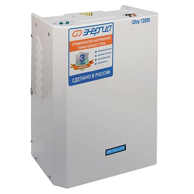 Стабилизатор напряжения Энергия Ultra 12000 -стабилизатор сетевого напряжения однофазный предназначен для непрерывного обеспечения качественным и стабильным электропитанием различных потребителей в условиях больших по значению и длительности отклонений напряжения в электрической сети от номинального, защиты приборов-потребителей от высокочастотных и высоковольтных импульсов.Прибор выполнен полностью из металлического корпуса,что способствует длительной эксплуатации.