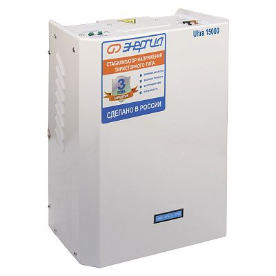 Стабилизатор напряжения Энергия Ultra 15000 -стабилизатор сетевого напряжения однофазный предназначен для непрерывного обеспечения качественным и стабильным электропитанием различных потребителей в условиях больших по значению и длительности отклонений напряжения в электрической сети от номинального, защиты приборов-потребителей от высокочастотных и высоковольтных импульсов.Прибор выполнен полностью из металлического корпуса,что способствует длительной эксплуатации.