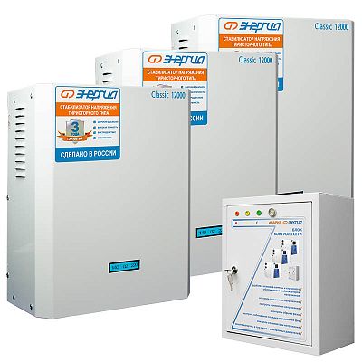 Стабилизатор напряжения Энергия Classic 36000 предназначен для обеспечения стабилизированным питанием трехфазных потребителей.Конструкция состоит из трех стабилизаторов напряжения Classic и общего блока контроля фаз (модуль БКС), который позволяет с помощью переключения выбрать трехфазный или однофазный режим работы и обеспечивает высокую степень защиты от аварийных ситуаций как во входной, так и в выходной сети.