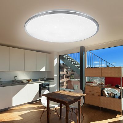 Бытовой декоративный светодиодный светильник с дистанционным управлением от ИК пульта. Особенности: 1. Регулируемые цветовая температура и яркость. 2. Режим "Ночник" в котором светильник светит с яркостью 10% от максимальной. 3. Таймер выключения через 30 или 60 минут. 4. Плафон с эффектом "звездное небо".