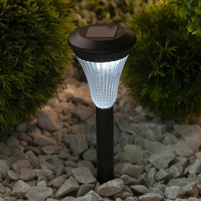 Классическая пластиковая модель садового светильника. Рифленое стекло плафона обеспечивает оригинальное свечение и красивые блики на освещаемой поверхности. Соотношение привлекательного дизайна и скромной цены обеспечивает стабильный спрос от сезона к сез