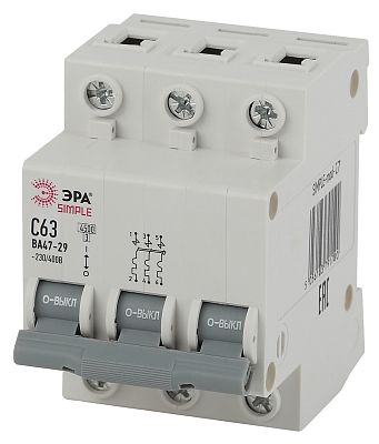 Основное назначение автоматического выключателя — это защита от возможной перегрузки и короткого замыкания. Покупка Автоматический выключатель ЭРА ВА47-29 3P 63А 4,5кА кривая C, SIMPLE-mod-27 (Б0039244) обеспечит надежную защиту электрооборудования от поломок из-за перегрузок и скачков напряжения. Просим обращать внимание на характеристики ЭРА.