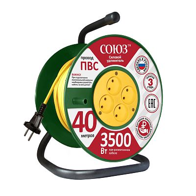 При подборе розеток, выключателей и других элементов для работы с электроэнергией учитывают не только электротехнические параметры, но и эстетику. Удлинитель силовой на катушке 4 гнезда 16А IP20 3500 Вт 40м Союз (481S-3304) — одна из лучших моделей в своем классе по обоим критериям. Производитель Союз сделал ставку на простую надежную конструкцию и современные материалы, которые обладают высокой устойчивостью к износу. Продукция прошла строгую проверку на безопасность и рассчитана на многолетнюю эксплуатацию в интенсивном режиме. Как официальный дистрибьютор мы готовы поставить любое количество товаров в кратчайшие сроки.