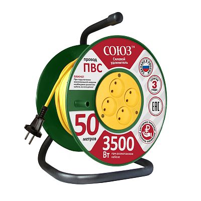 При подборе розеток, выключателей и других элементов для работы с электроэнергией учитывают не только электротехнические параметры, но и эстетику. Удлинитель силовой на катушке 4 гнезда 16А IP20 3500 Вт 50м Союз (481S-3305) — одна из лучших моделей в своем классе по обоим критериям. Производитель Союз сделал ставку на простую надежную конструкцию и современные материалы, которые обладают высокой устойчивостью к износу. Продукция прошла строгую проверку на безопасность и рассчитана на многолетнюю эксплуатацию в интенсивном режиме. Как официальный дистрибьютор мы готовы поставить любое количество товаров в кратчайшие сроки.