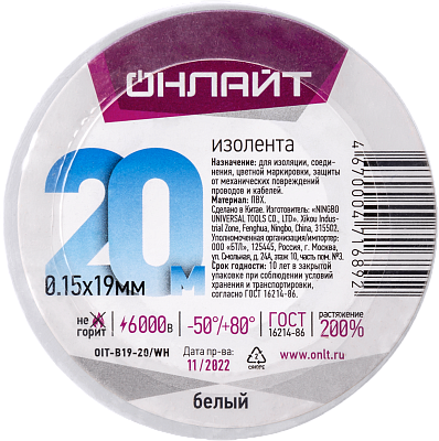 Электротехническая инфраструктура на объекте может иметь разную конфигурацию, в том числе довольно сложную со множеством подключенных потребителей, однако строгие требования к безопасности неизменны. Они прописаны в отраслевых стандартах и другой нормативной документации. И зависит итоговый результат непосредственно от качества электромонтажа и используемых комплектующих. Изолента ОНЛАЙТ 71 689 OIT-B19-20/WH ПВХ белая (71689) — небольшая, но очень важная деталь, которая тоже отвечает за корректную работу оборудования. Устанавливается довольно просто, но с эксплуатационными нагрузками при этом справляется на отлично. Качество гарантировано многоступенчатым контролем на заводе Онлайт. При заказе уточните артикул 71689 и количество позиций.