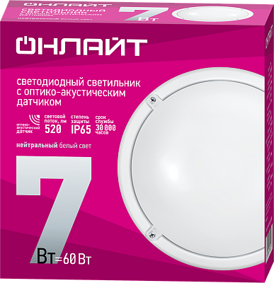К светотехнике на любом объекте, будь то жилое помещение или коммерческая площадка, предъявляют высокие требования. Необходимо не только продумать конфигурацию всех приборов, безопасную схему подключения, суммарную мощность и нагрузку на сеть, но и учесть требования дизайна, поскольку эстетике сегодня уделяется большое внимание. Светодиодный настенно-потолочный светильник ЖКХ светильник ОНЛАЙТ 71 622 OBL-R1-7-4K-WH-IP65-SNRV (71622) — современное решение, в котором учтены все требования. За надежность отвечают материалы с большим запасом прочности. Все элементы конструкции без проблем выдерживают интенсивную эксплуатацию. Такой вдумчивый подход к деталям является визитной карточкой бренда Онлайт.