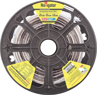 К светотехнике на любом объекте, будь то жилое помещение или коммерческая площадка, предъявляют высокие требования. Необходимо не только продумать конфигурацию всех приборов, безопасную схему подключения, суммарную мощность и нагрузку на сеть, но и учесть требования дизайна, поскольку эстетике сегодня уделяется большое внимание. Лента светодиодная Navigator NLS-3528B60-4.8-IP67-220V уп. 20м (14513) — современное решение, в котором учтены все требования. За надежность отвечают материалы с большим запасом прочности. Все элементы конструкции без проблем выдерживают интенсивную эксплуатацию. Такой вдумчивый подход к деталям является визитной карточкой бренда Navigator.