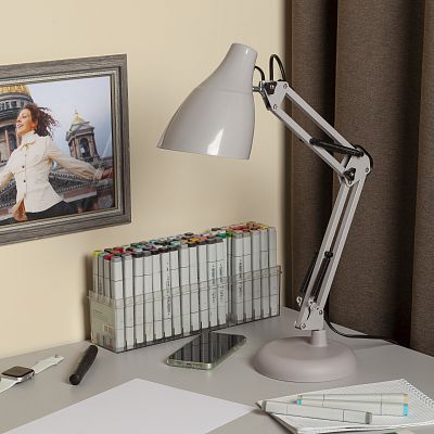 <p>Настольный светильник ЭРА N-123-Е27-40W-GY трендового дизайна с классической конструкцией может использоваться с разными источниками света - лампой накаливания, компактной люминесцентной лампой (КЛЛ) или светодиодной (LED) лампой. Выключатель на проводе. Устойчивое основание. Высота плафона регулируется двухсекционной сгибающейся стойкой, направление света - поворотом и наклоном плафона в любом направлении.</p>