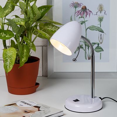 <p>Настольный светильник ЭРА N-116-Е27-40W-W с цоколем Е27 компактного размера для удобного размещения на столе. Может использоваться с лампой накаливания, компактной люминесцентной лампой (КЛЛ) или светодиодной (LED) лампой. У светильника металлические стойка и плафон, выключатель на основании. Высота расположения плафона регулируется сгибающейся стойкой, направление света - наклоном и поворотом плафона в любом направлении.</p>