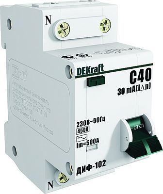 Автоматический выключатель дифференциального тока серии ДИФ-102 DEKraft; 1P+N; ном.ток 16 А; характеристика C; откл.способность Icn = 4,5 kA; ток утечки 30 мА; тип - АС; блок дифф.защиты – электронный; ширина – 2 мод. х 18 мм; монтаж – на DIN-рейку. АВДТ применяются в сетях напряжением до 220 В пер.тока для защиты чеовека от поражения электрическим током и электроустановок от сверхтоков и токов утечки. Аппараты ДИФ-102 являются более компактным вариантом АВДТ по сравнению с серией ДИФ-101.
