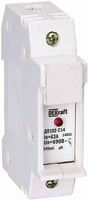 Держатель серии ДП-102 цилиндрического предохранителя ПЦ-102 DEKraft; 1P; для габарита С14 (14 x 51 мм); со светодиодной индикацией срабатывания; номинальный ток – до 64 А; ширина – 1 модуль х 18 мм; установка – на DIN- рейку; рабочее положение - любое, но предпочтительнее вертикальное; подключение питания - сверху или снизу; степень защиты – IP20. Предохранители применяются для защиты сетей от перегрузки и токов КЗ в сетях напряжением до 500 В.
