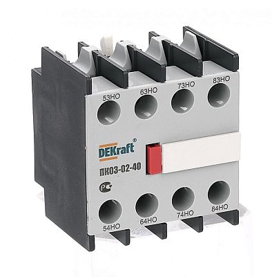 Приставка контактная серии ПК-03-02 для контакторов КМ-103 DEKraft; кол-во контактов - 4НО; ном.ток – 10 А; ном.напряжение – до 690 В; установка – с лицевой стороны; степень защиты – IP20. Приставки контактные предназначены для увеличения количества вспомогательных контактов контактора. Контактные приставки механически соединяются с контакторами и фиксируются при помощи защелки. Приставка подходит для использования с контакторами других производителей.