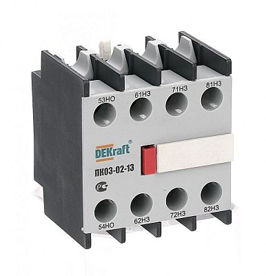 Приставка контактная серии ПК-03-02 для контакторов КМ-103 DEKraft; кол-во контактов - 1НО+3НЗ; ном.ток – 10 А; ном.напряжение – до 690 В; установка – с лицевой стороны; степень защиты – IP20. Приставки контактные предназначены для увеличения количества вспомогательных контактов контактора. Контактные приставки механически соединяются с контакторами и фиксируются при помощи защелки. Приставка подходит для использования с контакторами других производителей.