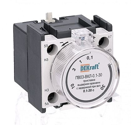 Приставка выдержки времени ПВ-03 для контакторов КМ-103 DEKraft; выдержка - 10…180 секунды; задержка - при включении; ном.ток – 10 А; ном.напряжение – до 690 В; монтаж – защелкой на контакторе; степень защиты – IP20. Приставки выдержки времени позволяют получить задержку замыкания или размыкания контактов цепи управления, например, в схема включения двигателя «звезда/треугольник» или для обеспечения паузы между циклами технологического процесса.