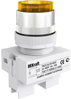 Лампа сигнальная ADDS серии ЛК-22 DEKraft; светодиодная; желтая неоновая; круглая; номинальное напряжение 220 В пер.тока; установка - на панели или двери; степень защиты - IP54. Лампы сигнальные предназначены для индикации состояния электрических цепей и коммутационных аппаратов. Использование в лампах светодиодных матриц (LED) снижает потребление электроэнергии. Низкая чувствительность к колебаниям напряжения позволяет использовать их в электрических цепях с нестабильным напряжением.