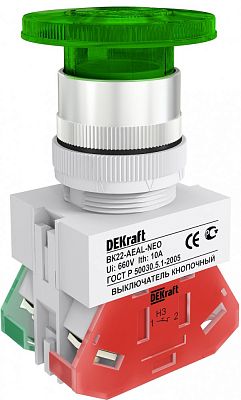 Выключатель кнопочный серии ВК-22 DEKraft; грибовидный толкатель; зеленый; с неоновой лампой; ном.ток 10 А; установка - на панели или двери; степень защиты - IP54; подключение - винтовыми зажимами. Выключатели кнопочные ВК-22 предназначены для коммутации электрических цепей и индикации состояния электрических цепей. Применяются в сетях переменного тока частотой 50/60 Гц с напряжением до 660В. Могут устанавливаться на подвижных и неподвижных частях стационарных установок.