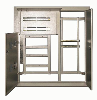 Щит распределительный этажный серии ЩЭ DEKraft; встраиваемый; на 4 квартиры; номинальный ток для одной квартиры - 63 А; ВхШхГ - 1000х950х150 мм; материал – сталь; цвет - серый (RAL 7035); степень защиты – IP31. Щиты этажные предназначены для установки счетчиков аналогового типа. Щиты поставляются в комплекте с шинами N и PE, крепежными болтами и пластиковыми окнами для учетных отсеков. Корпус щита этажного встраивается в нишу и состоит из 3 отсеков: учетный, распределительный и слаботочный.