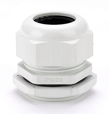 Кабельный ввод серии КВ-101 DEKraft; типа PG 36 диаметр кабеля – от 23 до 32 мм; цвет – белый; материал – пластик; степень защиты - IP54; количество в упаковке – 20 шт. Кабельный ввод состоит из фиксирующей гайки, корпуса, уплотнения из нейлона, а также из уплотнителя и прокладки из неопрена. Кабельные вводы имеют химическую стойкость к соленой воде, слабым кислотам, маслам, нефтепродуктам и основным растворителям. Конструкция кабельных вводов позволяет пропускать кабель без его демонтажа.