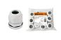Кабельный ввод серии КВ-101 DEKraft; типа PG 42 диаметр кабеля – от 32 до 38 мм; цвет – белый; материал – пластик; степень защиты - IP54; количество в упаковке – 20 шт. Кабельный ввод состоит из фиксирующей гайки, корпуса, уплотнения из нейлона, а также из уплотнителя и прокладки из неопрена. Кабельные вводы имеют химическую стойкость к соленой воде, слабым кислотам, маслам, нефтепродуктам и основным растворителям. Конструкция кабельных вводов позволяет пропускать кабель без его демонтажа.