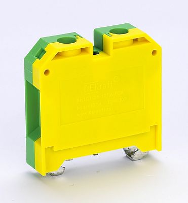 Зажим наборный серии ЗН-101 DEKraft ; номинальный ток - 125 А; сечение проводов от 3 до 35 кв.мм; цвет – желто-зеленый; материал корпуса - полиамид; материал клемм и винтов – латунь; монтаж - защелкиванием на DIN-рейку; количество в упаковке – 20 шт. Клемма выполнена таким образом, что обеспечивает двойной обжим проводника. Это обеспечивается в том числе и за счет насечек на клеммах. Зажимы наборные желто-зеленого цвета применяются для подключения нулевого защитного проводника PE.