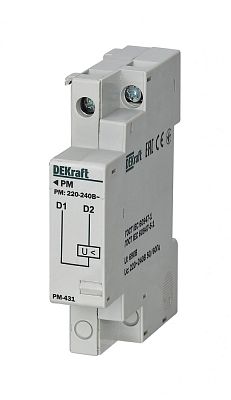 Расцепитель минимального напряжения серии РМ-431 DEKraft; ном. переменное напряжение 220-240 В; напр. срабатывания 70-110% от номинального; установка в корпус автоматического выключателя ВА-431 справа. Расцепитель минимального напряжения РМ-431 - шунтовой расцепитель, который даёт возможность 3-х полюсному автоматическому выключателю серии ВА-431 размыкаться или замыкаться с временной задержкой или без неё в тех случаях, когда напряжение на выводах расцепителя снижается ниже заранее установленного значения