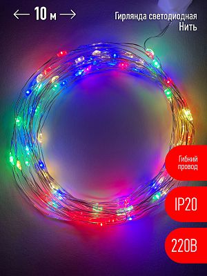 <p>Многоцветная новогодняя гирлянда ЭРА &quot;Нить&quot; длиной 10 метров. Представляет собой тонкую полупрозначную нить, на которой расположены 100 микросветодиодов. Гибкий провод даёт возможность с удобством украшать этой гирляндой дом или общественное пространство, формировать световые композиции, светящиеся надписи. Компактные LED-элементы последнего поколения не перегреваются, ярко светят, тратят минимум электроэнергии. Гирлянда работает от стандартной электросети 220 В и отвечает всем требованиям пожарной безопасности. Создавайте праздничное настроение вместе с ЭРА!</p>