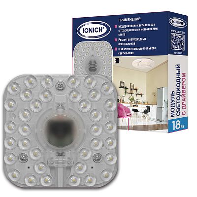 К светотехнике на любом объекте, будь то жилое помещение или коммерческая площадка, предъявляют высокие требования. Необходимо не только продумать конфигурацию всех приборов, безопасную схему подключения, суммарную мощность и нагрузку на сеть, но и учесть требования дизайна, поскольку эстетике сегодня уделяется большое внимание. Модуль светодиодный для декоративных светильников ТМ IONICH 18 Вт 1440 Лм 230 В 6500 К 140х140 мм IP20 (1775) — современное решение, в котором учтены все требования. За надежность отвечают материалы с большим запасом прочности. Все элементы конструкции без проблем выдерживают интенсивную эксплуатацию. Такой вдумчивый подход к деталям является визитной карточкой бренда IONICH.