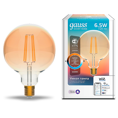 Лампа выполнена из качественных материалов, что обеспечивает ее надежность и долговечность. Она имеет специальное покрытие, который создает декоративное освещение. Декоративная лампа позволит создать неповторимый интерьер в помещении. Лампа светодиодная Gauss Filament Smart Home DIM+CCT E27 G95 Golden 6,5Вт 2000-5500К (1340112) поможет вам создать комфортную и красивую атмосферу у себя дома или в кафе. Посмотрите весь ассортимент Gauss.