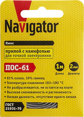 Залогом качественного электромонтажа является правильный выбор расходников и инструмента. Припой Navigator 93 091 NEM-Pos03-61K-2-S1 (ПОС-61, спираль, 2 мм, 1 м) (93091) — проверенное решение, с которым работа пойдет гораздо быстрее, а результат будет соответствовать строгим отраслевым стандартам и другим нормативным требованиям. Позиция 93091 пользуется спросом и у профессионалов, обслуживающих сложные и ответственные объекты, и у обычных пользователей, которые сталкиваются с аналогичными задачами в быту. Работать с товарами Navigator действительно просто, а их быструю доставку мы берем на себя.