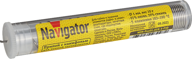 Залогом качественного электромонтажа является правильный выбор расходников и инструмента. Припой Navigator 93 097 NEM-Pos01-61K-1-F10 (ПОС-61, колба, 1 мм, 10 гр) (93097) — проверенное решение, с которым работа пойдет гораздо быстрее, а результат будет соответствовать строгим отраслевым стандартам и другим нормативным требованиям. Позиция 93097 пользуется спросом и у профессионалов, обслуживающих сложные и ответственные объекты, и у обычных пользователей, которые сталкиваются с аналогичными задачами в быту. Работать с товарами Navigator действительно просто, а их быструю доставку мы берем на себя.