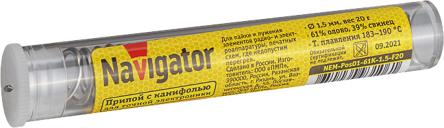 Залогом качественного электромонтажа является правильный выбор расходников и инструмента. Припой Navigator 93 106 NEM-Pos01-61K-1.5-F20 (ПОС-61, колба, 1.5 мм, 20 гр) (93106) — проверенное решение, с которым работа пойдет гораздо быстрее, а результат будет соответствовать строгим отраслевым стандартам и другим нормативным требованиям. Позиция 93106 пользуется спросом и у профессионалов, обслуживающих сложные и ответственные объекты, и у обычных пользователей, которые сталкиваются с аналогичными задачами в быту. Работать с товарами Navigator действительно просто, а их быструю доставку мы берем на себя.