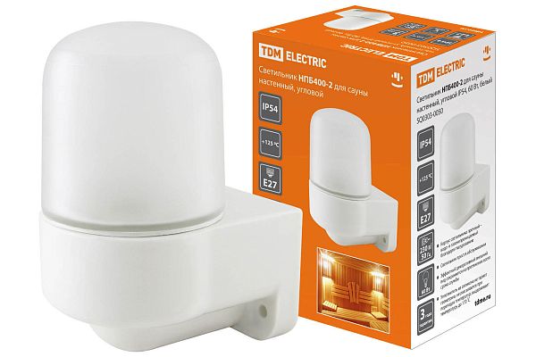 К светотехнике на любом объекте, будь то жилое помещение или коммерческая площадка, предъявляют высокие требования. Необходимо не только продумать конфигурацию всех приборов, безопасную схему подключения, суммарную мощность и нагрузку на сеть, но и учесть требования дизайна, поскольку эстетике сегодня уделяется большое внимание. Светильник ЖКХ НПБ400-2 для сауны настенный, угловой, IP54, 60 Вт, белый, TDM (SQ0303-0050) — современное решение, в котором учтены все требования. За надежность отвечают материалы с большим запасом прочности. Все элементы конструкции без проблем выдерживают интенсивную эксплуатацию. Такой вдумчивый подход к деталям является визитной карточкой бренда TDM.