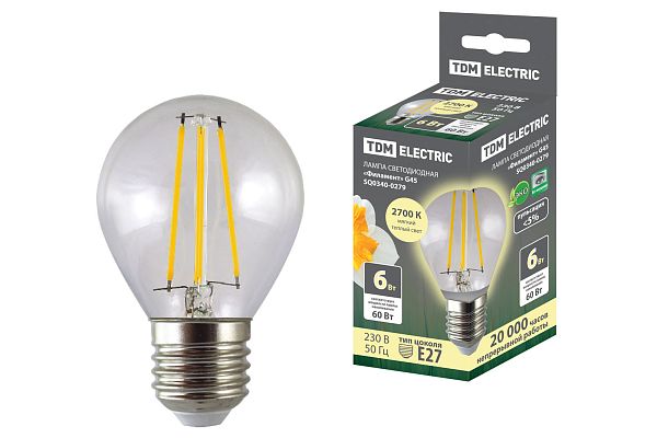 К светотехнике на любом объекте, будь то жилое помещение или коммерческая площадка, предъявляют высокие требования. Необходимо не только продумать конфигурацию всех приборов, безопасную схему подключения, суммарную мощность и нагрузку на сеть, но и учесть требования дизайна, поскольку эстетике сегодня уделяется большое внимание. Лампа светодиодная "Филамент" G45-6 Вт-230 В-2700 К–E27 TDM (SQ0340-0279) — современное решение, в котором учтены все требования. За надежность отвечают материалы с большим запасом прочности. Все элементы конструкции без проблем выдерживают интенсивную эксплуатацию. Такой вдумчивый подход к деталям является визитной карточкой бренда TDM.